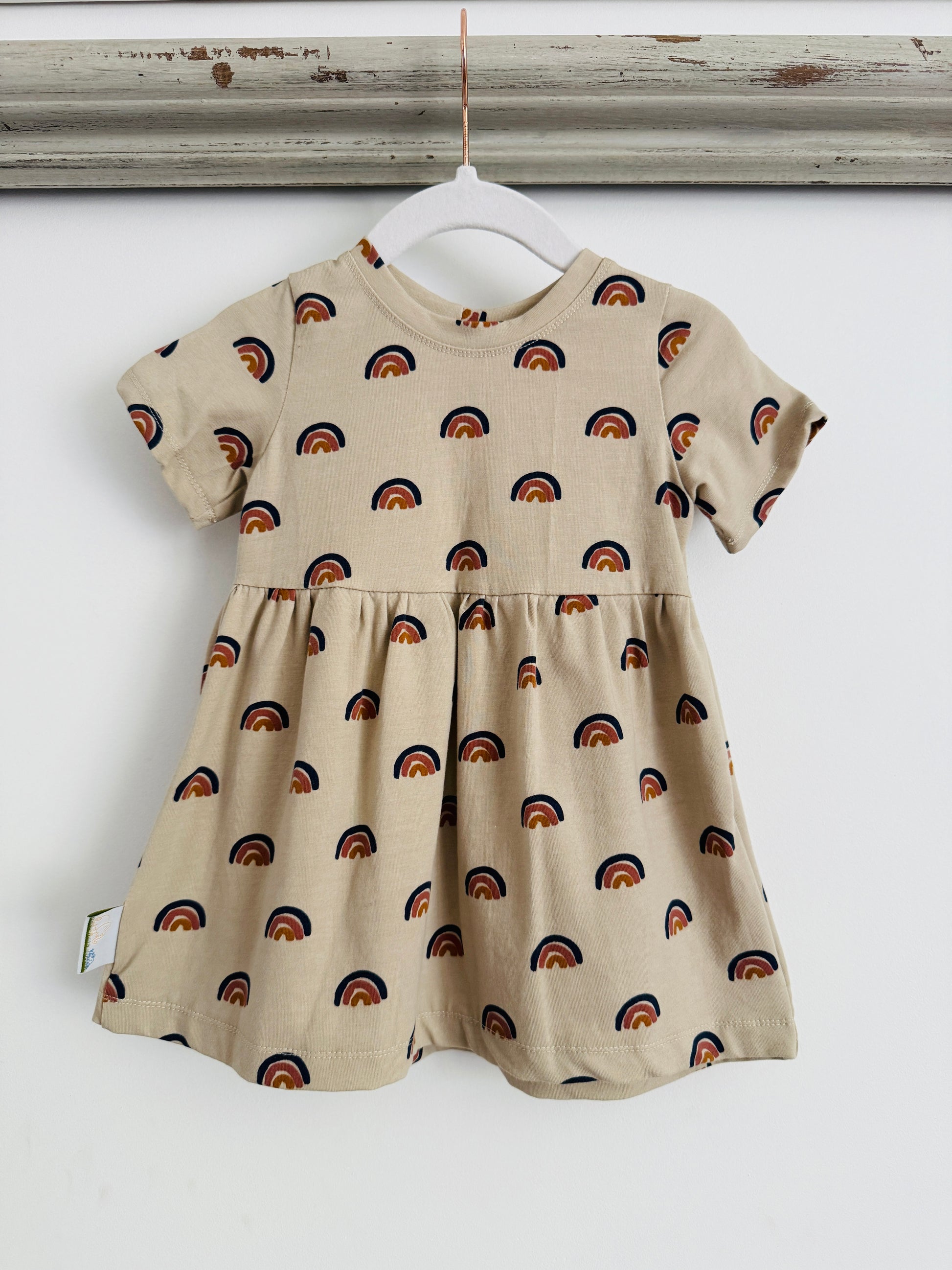 This Rainbow dress is made out of soft and stretchy sustainably sourced Jersey material. Better on precious skin and a kinder option in terms of the environment. Perfect for climbing and having all sorts of adventures.