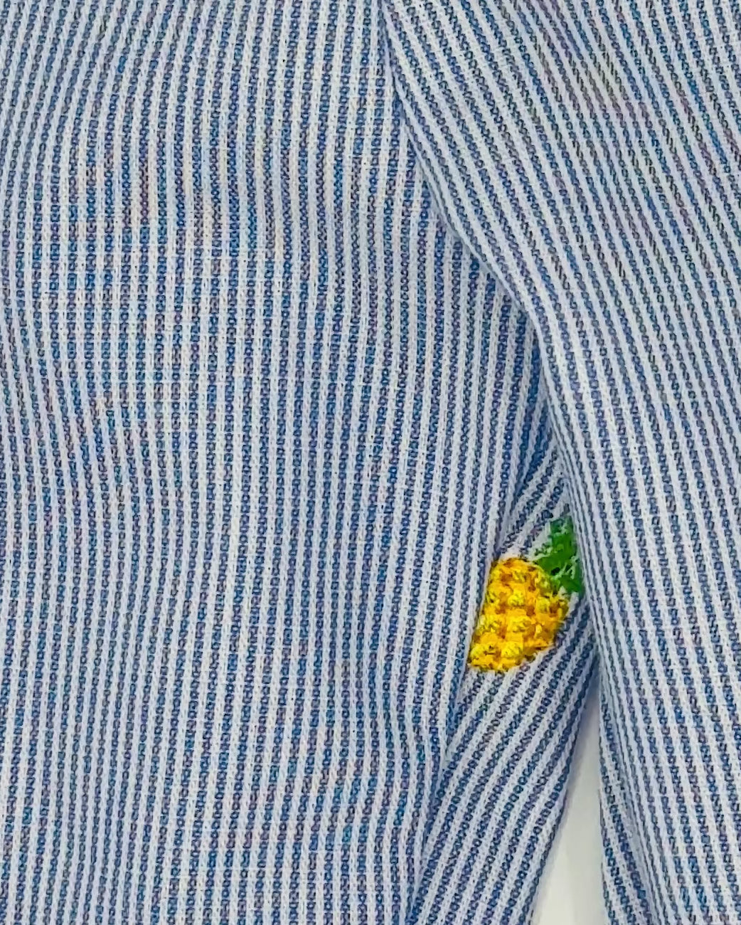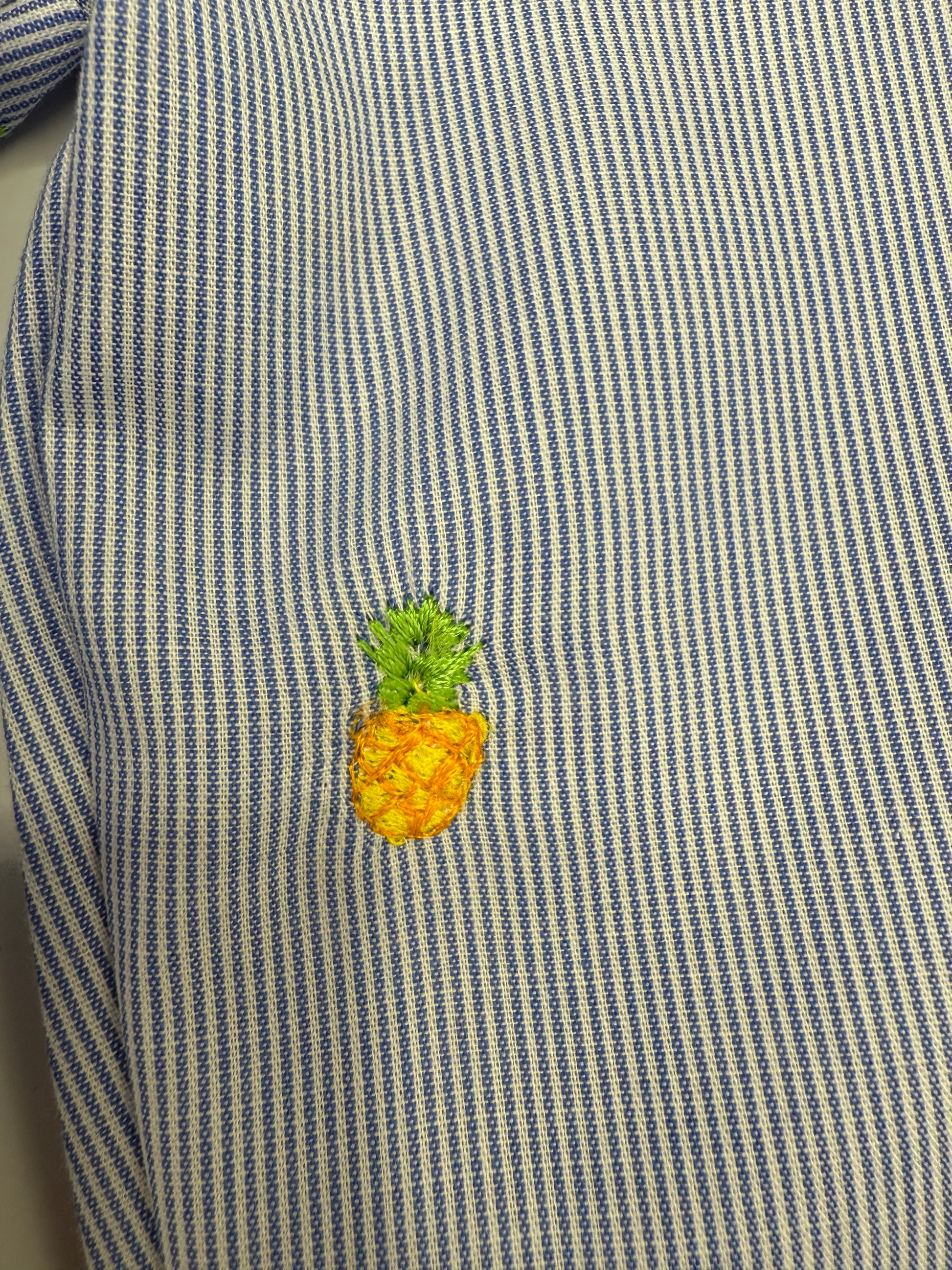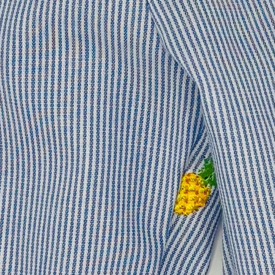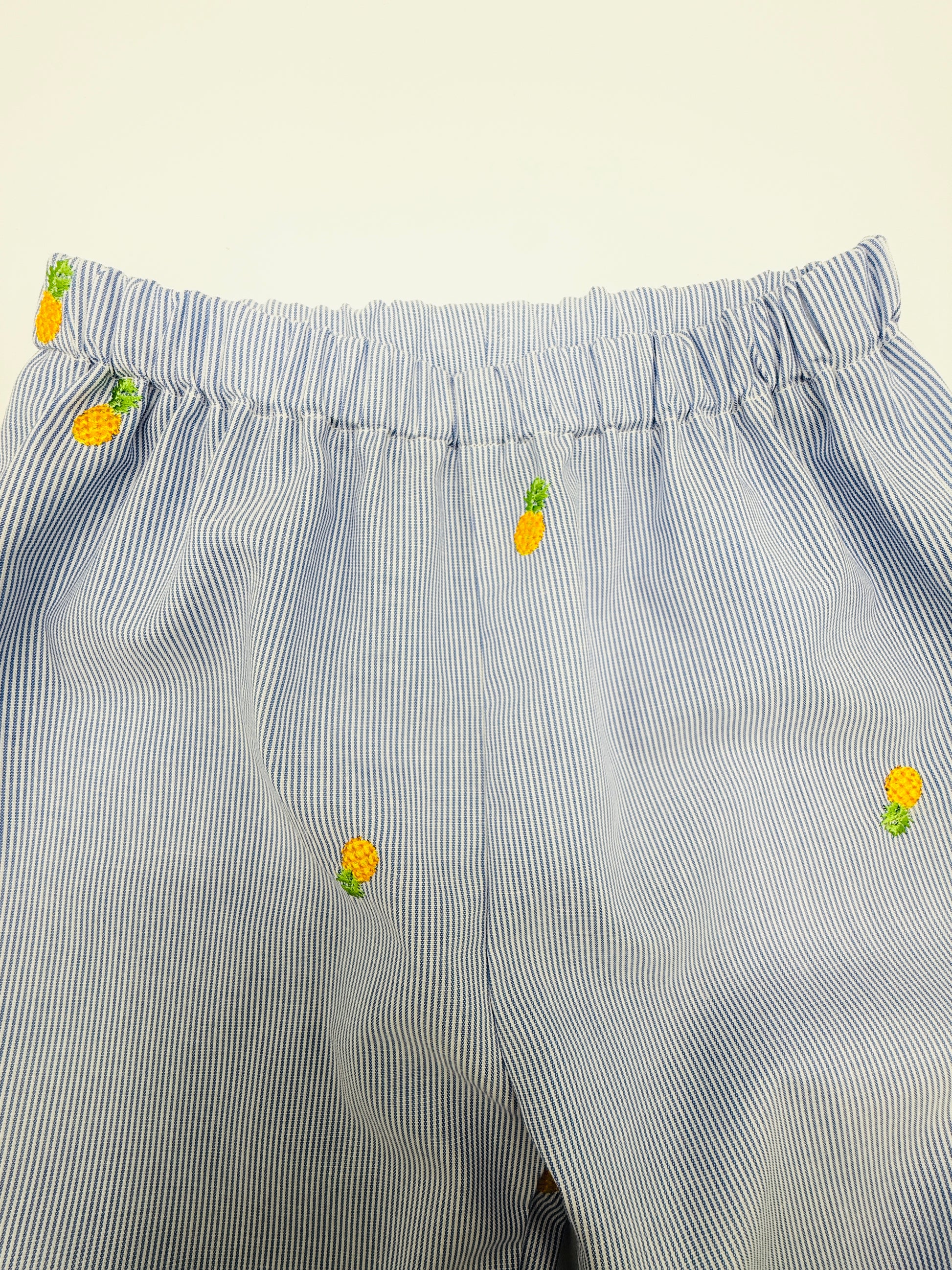 These beautiful and light unisex pinstripe wider leg trousers have a fantastic embroidered pineapple detail. The fabric is 100% cotton and handmade with an elasticated waist for extra stretch.
