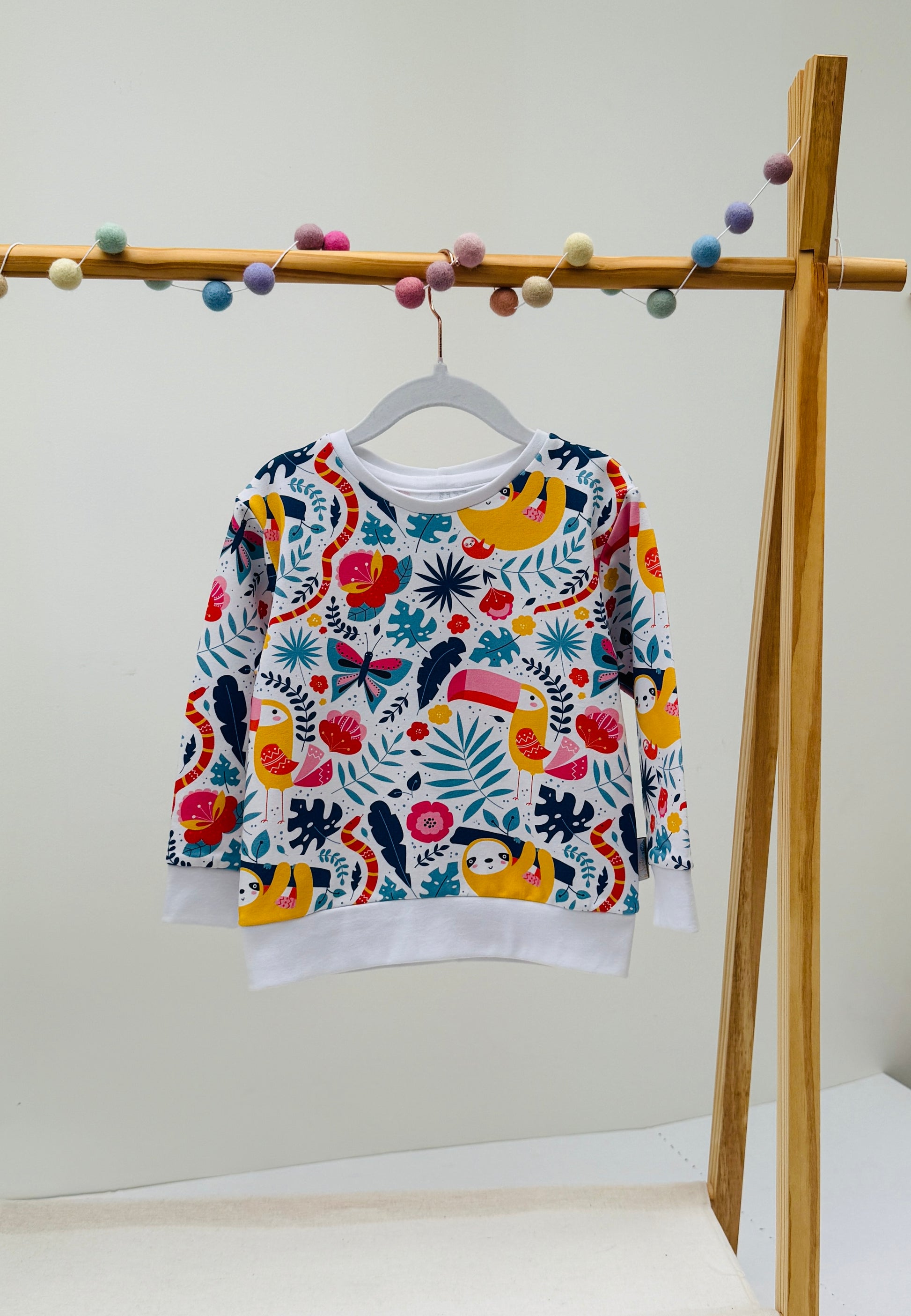 Rainforest Friends is a wonderfully vibrant and fun jumper. Made of Organic French Terry. This will brighten up any gloomy day.